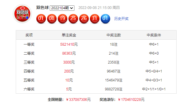 双色球22104期开出奖,本期奖号:红球01 08 19 25 26 31,蓝球01。当期红球号码大小比为4:2,三区比为2:1:3,奇偶比为4:2。形态方面,本期红球开出1组连号25 26,1组同尾号01 31;蓝球时隔22期再次开出最小码01。