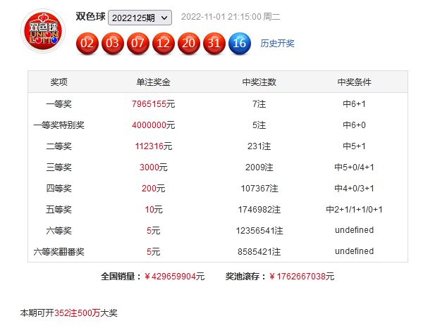 双色球第2022125期奖号为:02、03、07、12、20、31+16。