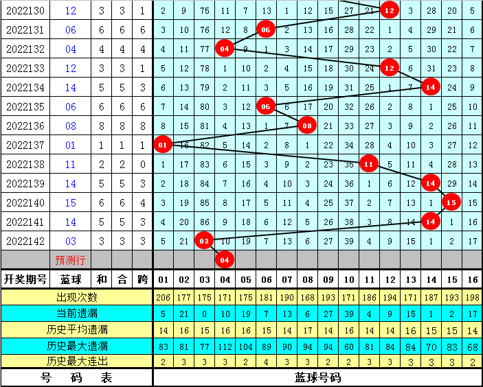 蓝球分析:最近9周星期二蓝球分别开出号码:01、04、05、16、01、06、14、01、15,本周星期二预计蓝球为偶数号码,关注蓝球号码04。