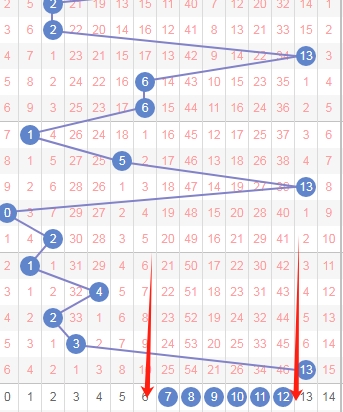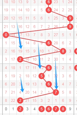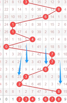 上图是体彩七星彩从左到右定位第六位数字走势图,我在上面走势图中标注出来的蓝色箭头表示开出数字的遗漏周期,上期开出数字8遗漏周期是10期,上上期开出数字2遗漏周期是23期,根据这个遗漏周期分析的话,本期可以关注遗漏周期小的数字234678,个人最看好数字246。