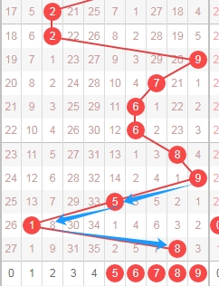 上图是体彩七星彩从左到右定位第一位数字走势图,我在上面走势图中标注出来的蓝色箭头表示遗漏周期,上面数字7遗漏周期是33期,那么本期可以关注出遗漏周期小的数字25678,个人最看好567。