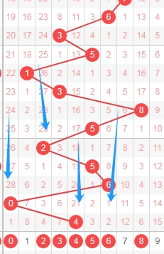 上图是体彩七星彩从左到右定位第五位数字走势图,我在上面走势图中标注出来的蓝色箭头表示开出数字的遗漏周期,上期开出数字4遗漏周期是21期,上上期开出数字0遗漏周期是28期,根据这个遗漏周期分析的话,本期可以关注遗漏周期小的数字0234568,个人最看好数字0256。