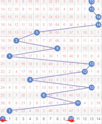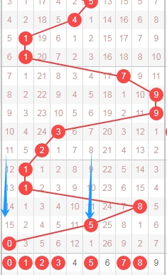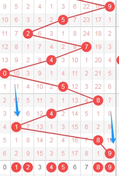 上图是体彩七星彩从左到右定位第六位数字,我标注出来的蓝色箭头表示跨度,上期开出数字1跨度是从数字9到数字1跨度是8,那么本期可以关注出走势跨度小的数字012345,个人最看好数字01245。