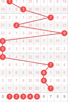 上图是体彩七星彩蓝球开奖号码走势分布图,我标注出来的数字是蓝球0尾数数字0 10,到本期为止蓝球0尾数的数字已经连续遗漏了27期,那么本期或者近期大家还是要留意一下蓝球0尾数的数字0 10。