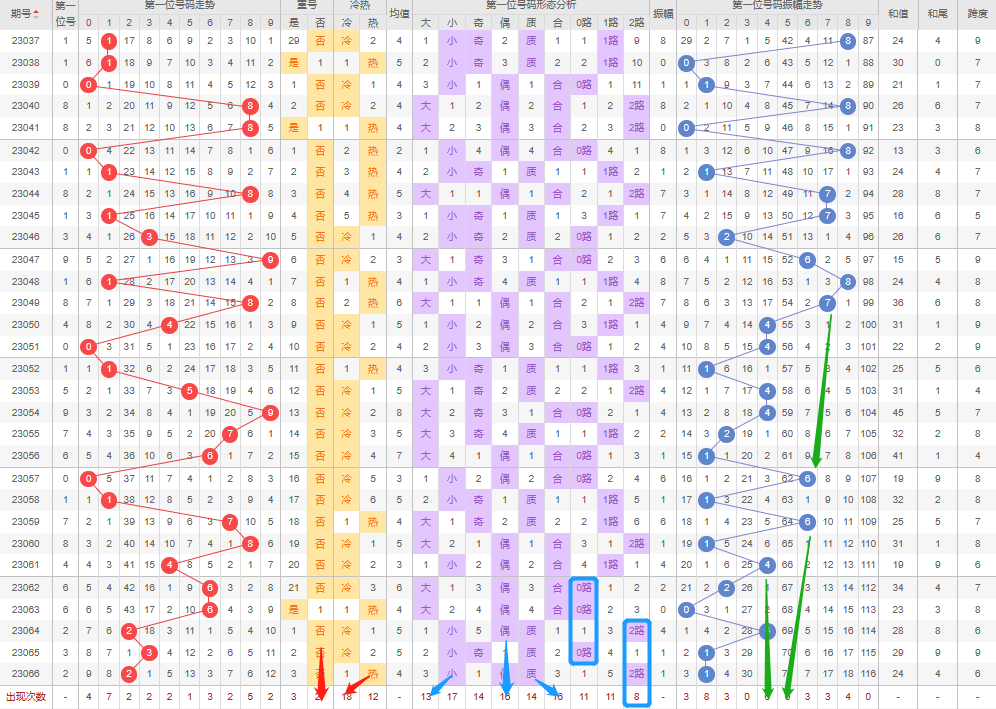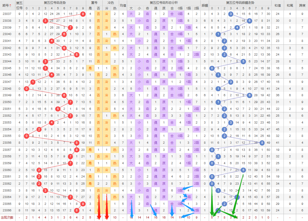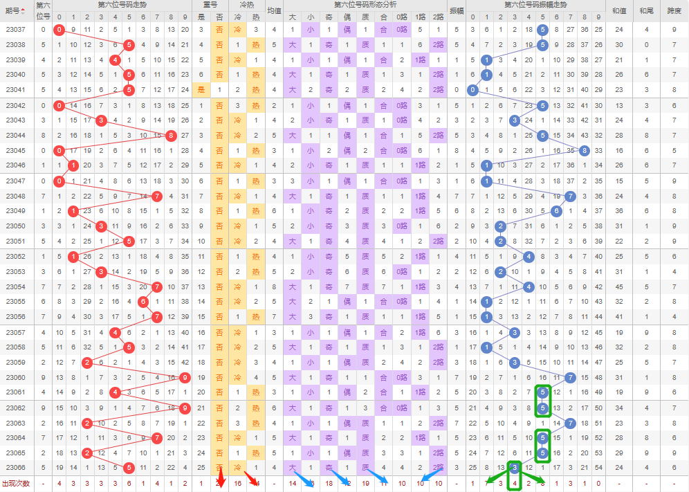 回顾上期预测的第七个号码:重号看否-正确;冷热值防热-错误;大小号防小号-正确;奇偶数防奇-正确;质合数防质数-正确;012路防2路-错误;振幅走势方向3-正确;(上期根据小号和奇数取值1、3、5、7再根据振幅就剩下3、5、7,然后翻硬币交给老天吧,命里有时终须有,命里无他莫强求)