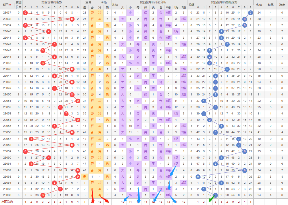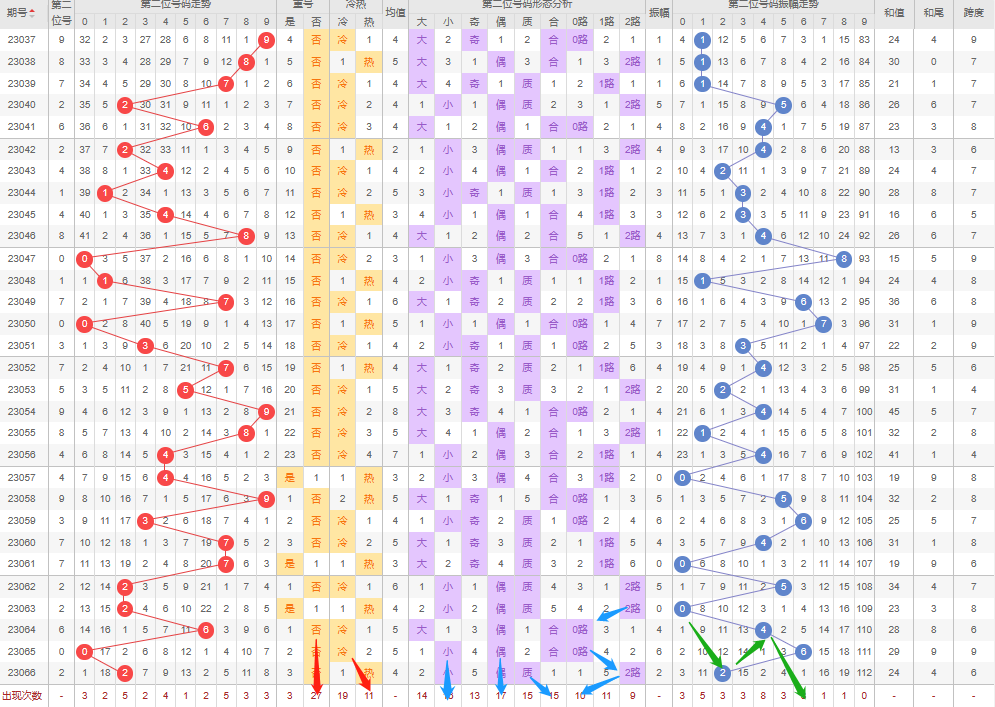 回顾上期预测的第二个号码:重号为否-正确;冷热值防冷-错误;大小号防大号-错误;奇偶数防奇数-错误;质合数防质数-正确;012路防2路-正确;振幅走势方向-错误;(总体偏差较大,但如果顺着顺着2路找就能得出258,就有机会命中)