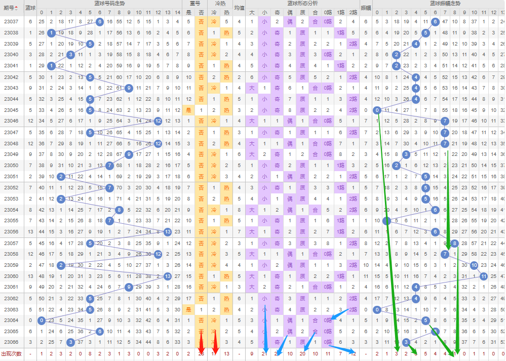 七星彩和双色球类似,一定要抓住蓝球,那么就可以立于不败之地,相比于大乐透难度会小一点,所以各位彩友们一定要多花精力在蓝球上。所有的图示需要结合起来区看,不要断章取义,结合你们自己常用的成功率高的方法组合,才能迈出那成功的一步!