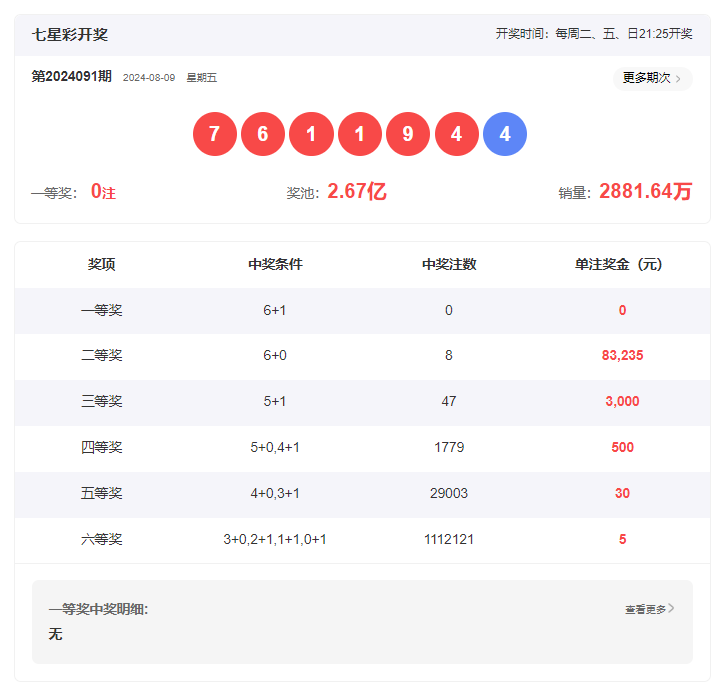 七星彩24091期开奖结果7 6 1 1 9 4 + 4