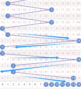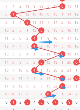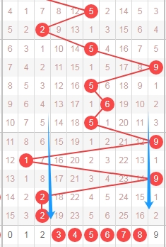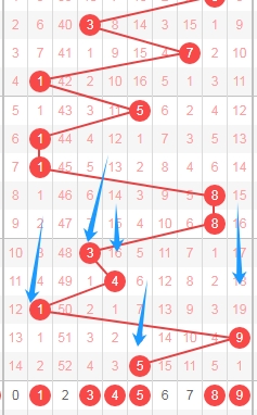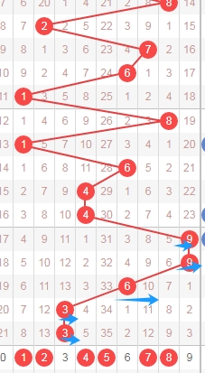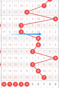 从号码之间的跨度来分析,上图是体彩七星彩开奖号码走势图中从左到右第七位,上期开出数字13,数字形式是1路球数字,质数奇数,看上面走势图中标注出来的蓝色大箭头就知道,最近这位数字开出的跨度大的居多,开出的跨度小的少,那么本期关注这位数字出小跨度,小跨度话数字就是8 9 10 11 12 13 14,个人看好数字9 10 12 14。