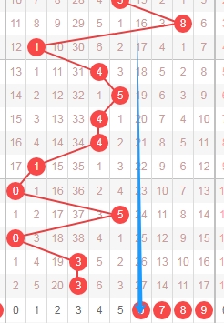 从号码区域来分析,上图是体彩七星彩开奖号码走势图中从左到右第五位,上期这位数字开出号码7,数字形式是奇数质数1路球数字,我在上面标注出来的数字这个区域01234已经连续7期没出现号码,那么本期个人观点就是关注这个区域出号码,个人看好数字0和数字3还有数字4。
