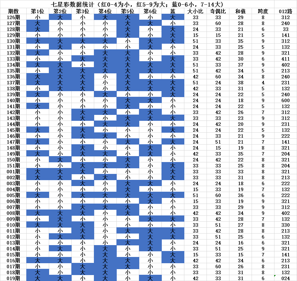 30期内蓝球位出号情况为:开出大码13次,开出小码17次,小码热出,趋势看好本期7-14范围出蓝(且小小小规律出来后,多接出大码,看好大码持续走热,主看8+12+13+14四码)
