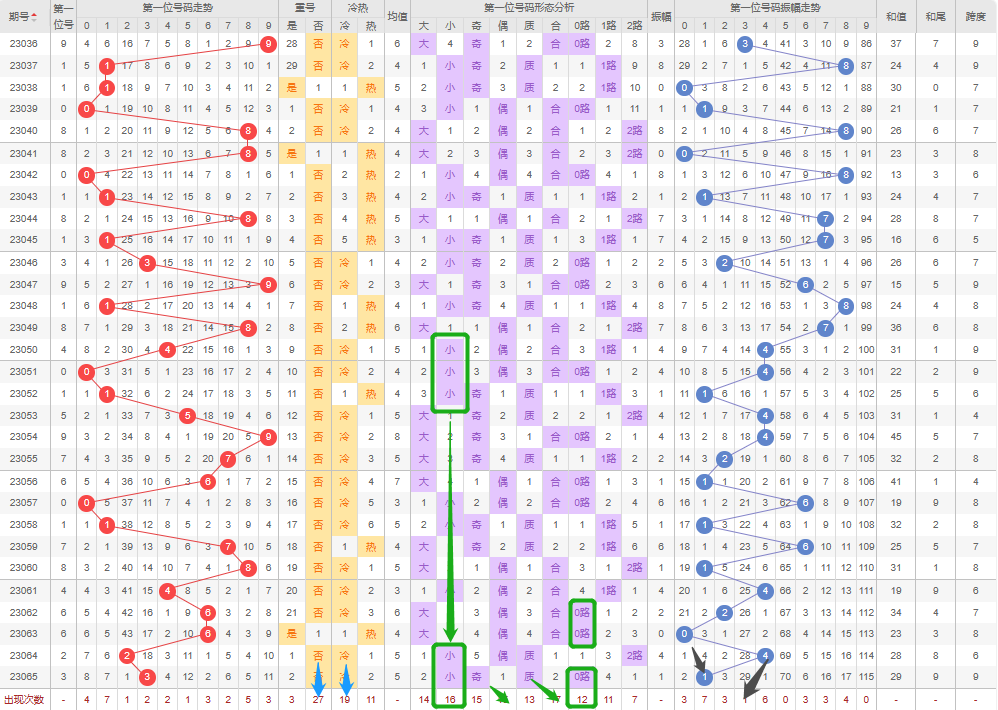 回顾上期预测的第一个号码:重号为否-正确;冷热值防热-错误;大小号防大号-错误;奇偶数防偶数-错误;质合数防合数-错误;012路防2路-正确;振幅走势方向-错误;(上期错误率较多还是没有仔细甄别数据的有效性)