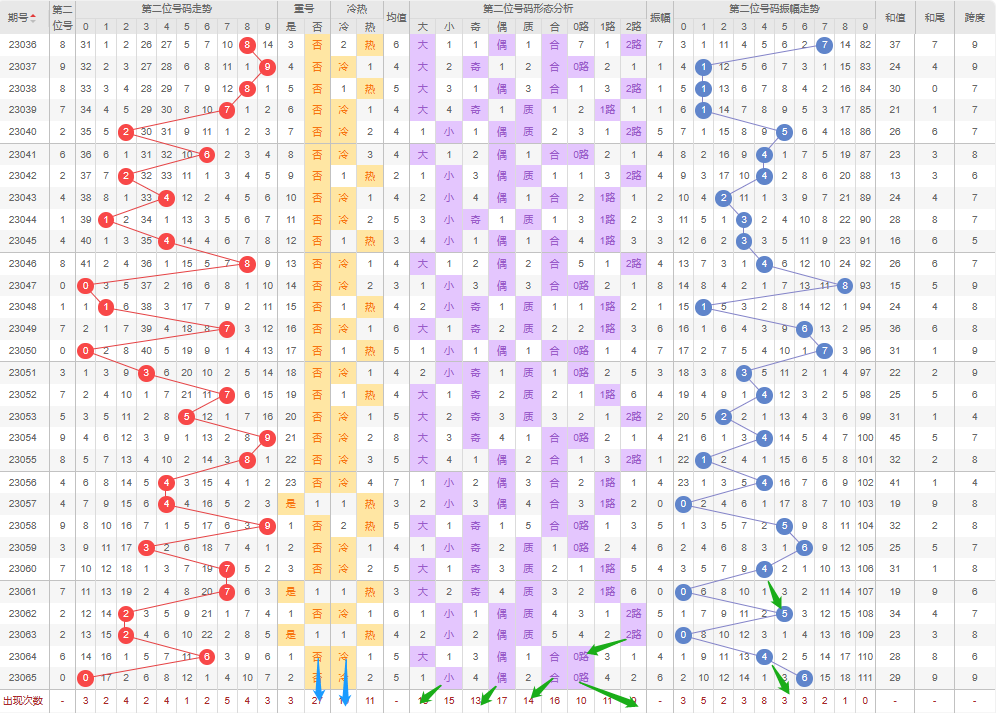 本期预测第二个号码:近30期重号出现3次,上期没有连续交叉开出,所以本期不必看好重号;近30期冷热比为19:11,冷值上期开出,有极值方向趋势,故本期继续看冷值;近30期大小比为15:15,走势平稳且上期开出小号,故本期看回补大号;近30期奇偶比为13:17,上一个周期偶数开出四期所以有回补需求,故本期看奇数;近30期质合比为14:16,合数连开两期奇数有回补需求,故本期防质数;012路比为10:11:9,从对称理论来看倾向于回防2路,故看2路;振幅走势来看,从遗漏周期对称来看,故振幅看5防0。
