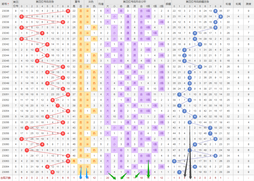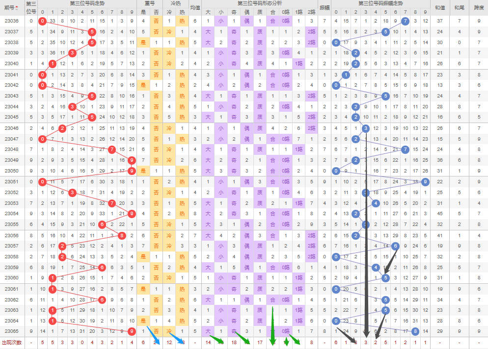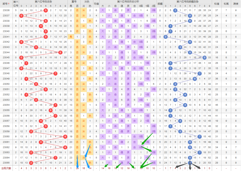 回顾上期预测的第六个号码:重号为否-正确;冷热值防冷-错误;大小号防小号-正确;奇偶数防偶-正确;质合数防合数-错误;012路防2路-正确;振幅走势方向5-正确;(通过上述属性,我们可以很容易分辨一旦012路合振幅分析对了,那么这个号码必中,比如上期我选择了2路那就是258,振幅选择连坐5,那么就只剩2选择了,兵不血刃完成收编)