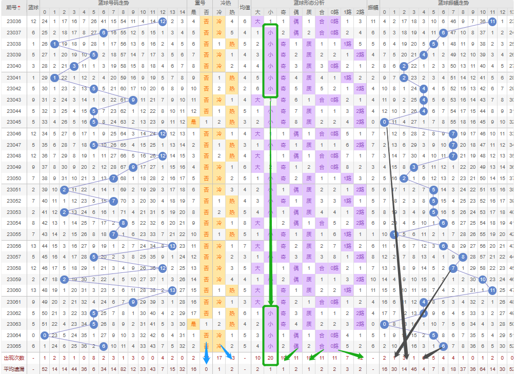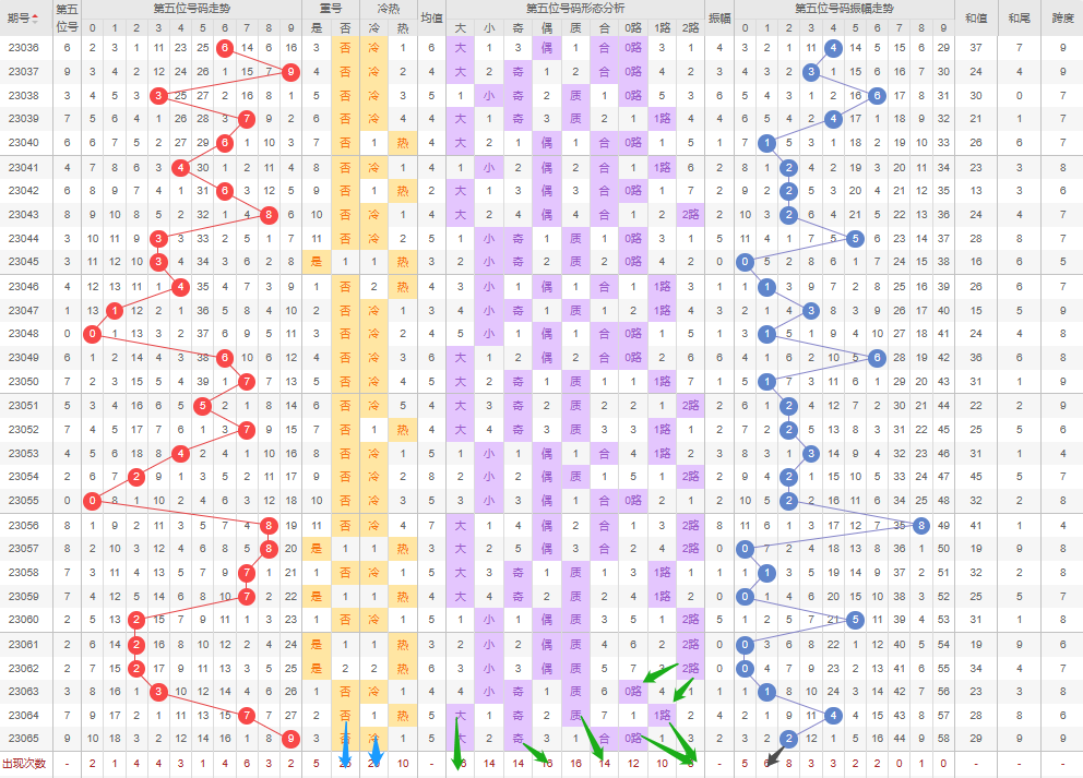 回顾上期预测的第五个号码:重号为否-正确;冷热值防冷-正确;大小号防大号-正确;奇偶数防奇数-正确;质合数防质数-错误;012路防2路-错误;振幅走势方向2-正确;(七对五,如果根据大奇数冷值和振幅的话基本能以很小的代价拿下此号)