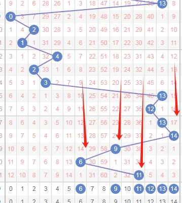 上图是体彩七星彩蓝球开奖号码走势分布图,我在上面走势图中标准出来的红色大箭头表示遗漏周期,上期开出数字11遗漏周期是39期,最近几期开出的遗漏周期都有点大,那么本期可以关注遗漏周期小的数字,那么就是数字6 9 11 12 13 14。