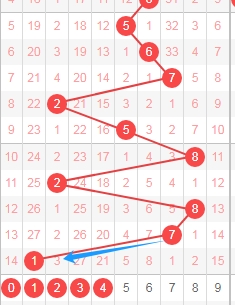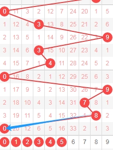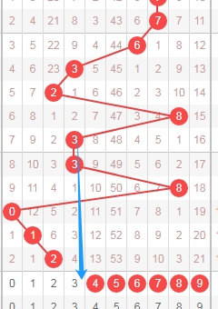 上图是体彩七星彩从左到右定位第三位数字走势图,我标志出来的蓝色箭头表示跨度,上期是数字8走数字0跨度是8,属于大跨度,那么本期可以关注出小跨度的数字012345,个人最看好数字0123。