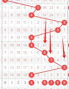 上图是体彩七星彩从左到右定位第四位数字走势图,我标志出来的蓝色箭头表示遗漏周期上次开出数字4遗漏周期是40期,最近这个遗漏周期都是大的,那么本期关注出遗漏周期小的数字034589,个人最看好数字0348。