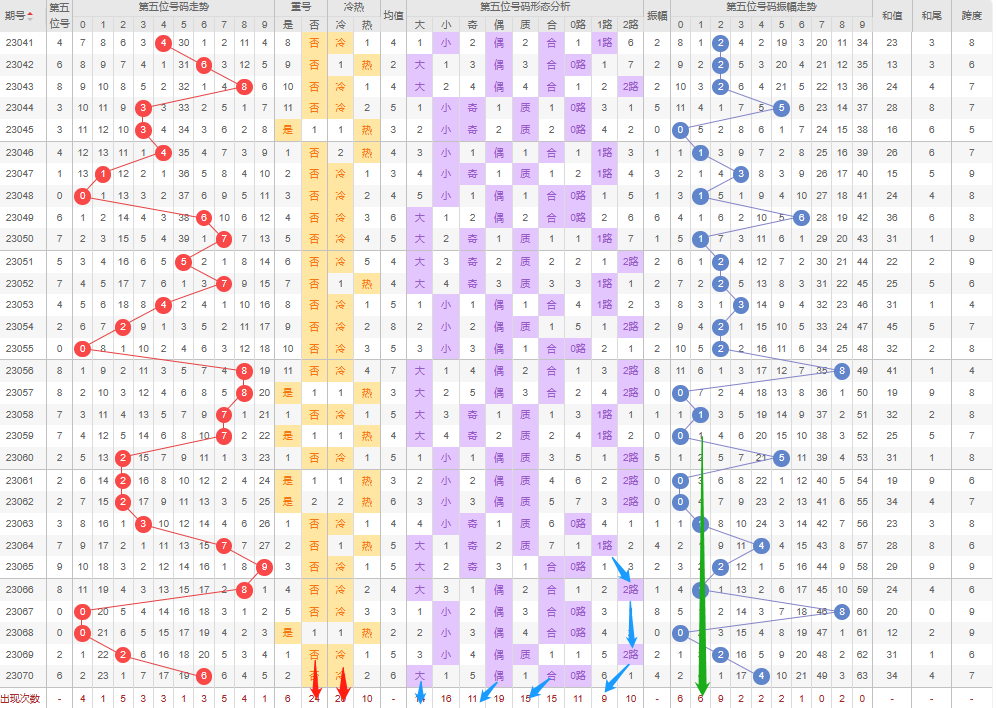 回顾上期预测的第五个号码:重号为否-正确;冷热值防热-错误;大小号防大号-正确;奇偶数防偶数-正确;质合数防质数-错误;012路防0路-正确;振幅走势方向4-正确;(这个号根据0路合振幅4,完全可以得出结论6,这个号如果不中就不宜应该了)