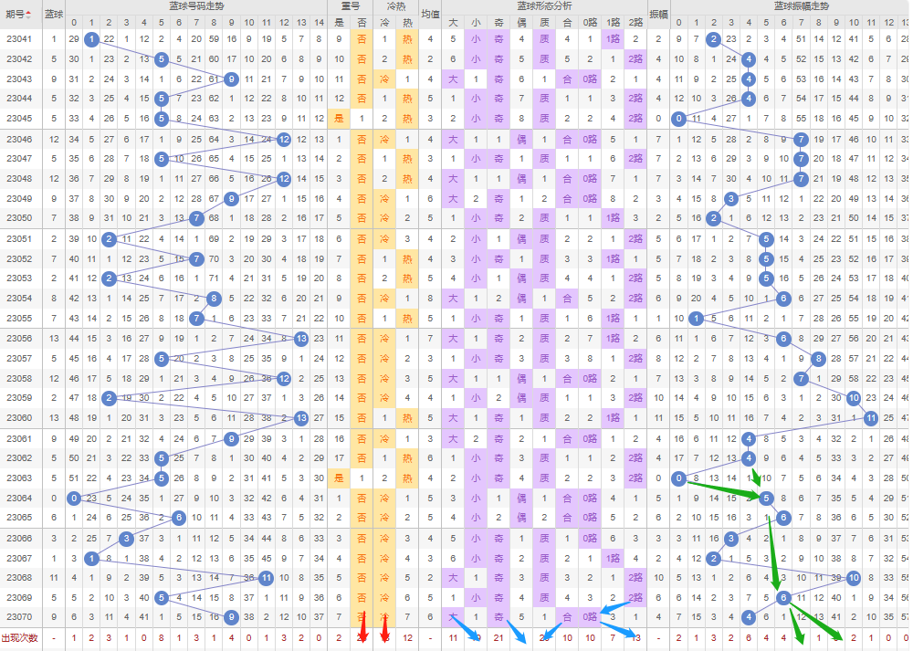 七星彩和双色球类似,一定要抓住蓝球,那么就可以立于不败之地,相比于大乐透难度会小一点,所以各位彩友们一定要多花精力在蓝球上。所有的图示需要结合起来区看,不要断章取义,结合你们自己常用的成功率高的方法组合,才能迈出那成功的一步!