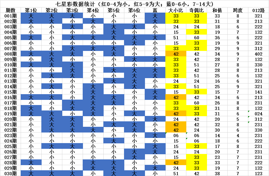 根据上图,近30期内前六位连续开出热小码趋势后,大码趋势回补,常出大小比为33+42,主看33。