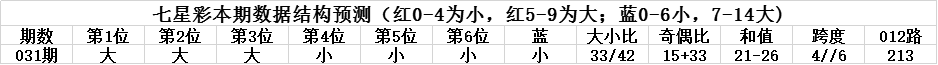 本期可参考大小比为33(趋势来看小几率42),跨度4/6,奇偶比主33防15。