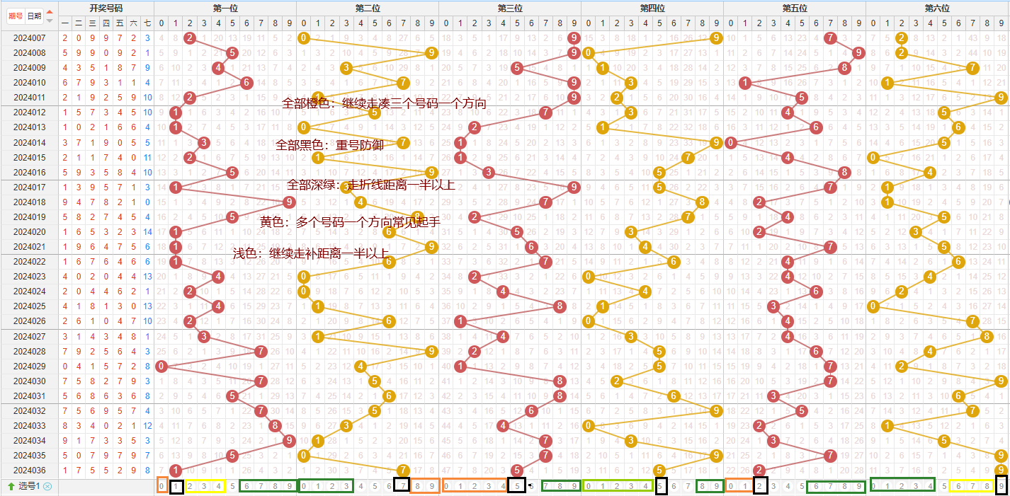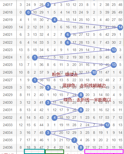 如果考虑近期的折线情况本期考虑走距离一半以上,为6、7、8、9,也可以考虑非常少见但出现过的折线距离一半以内情况,也就是2、3、4、5