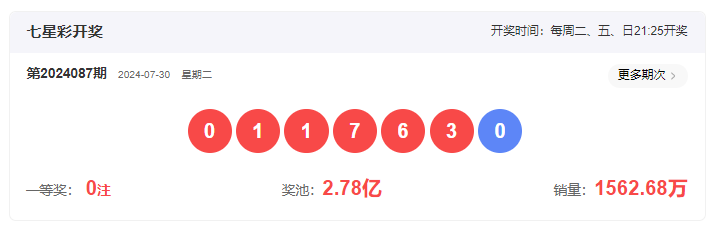 七星彩24087期开奖结果为:0 1 1 7 6 3 + 0