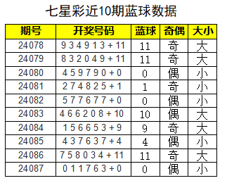 七星彩第24087期的和值为18,和尾值8,奇偶比为4:2,大小比4:2, 跨度为:7 。