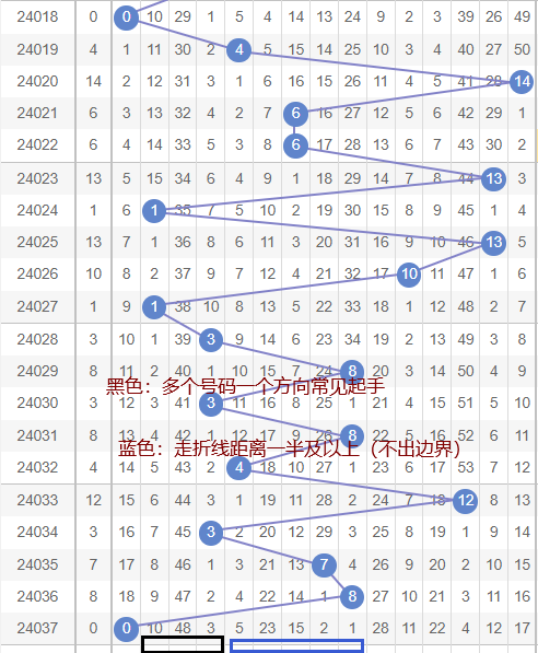 本期考虑走折线但是继续多个号码一个方向,常见起手式1、2、3,或者考虑走折线距离一半及以上不出边界,对于本期是4、5、6、7、8