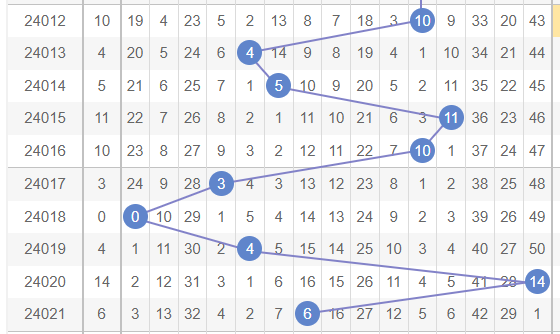 如果看近20期小步后折线走中步伴随一个小步,就考虑4~6。脱离任何走势考虑0~3