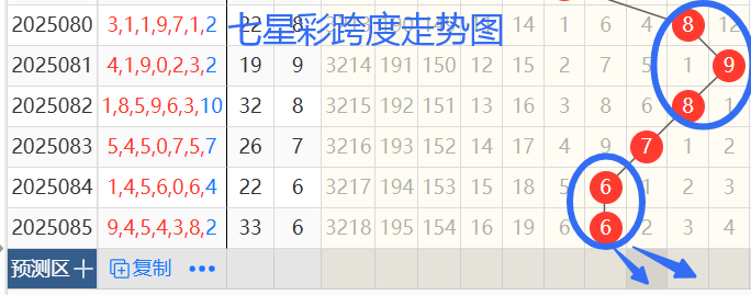 2)我们来看跨度,以081期——085期为例,如图依次是98766跨度,按照012路的排序是02100路跨度,后面两期是同路跨度,根据路数转换关系来看,本期1 0路跨度,那么跨度我们暂定258147跨,个人比较看好 7 8 跨度
