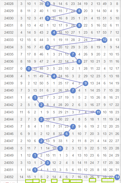 根据近期走势,本期考虑走折线边界差一步、边界、折线距离一半情况,结果是0、2、4、6、10、12、13(边界差一步)、1(边界)、7、8(折线距离一半)