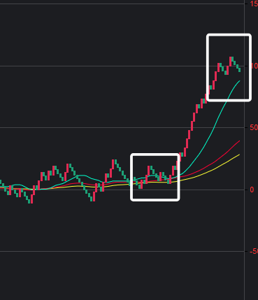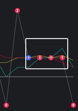 5码1 2 3 6 14,整体向上,近期向上,遗漏2期,可以看到一些规律,但白框中实际上表现了两种可能:一种是接下来会出一期,一种是接下来几期都不出。