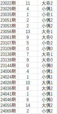 将上期蓝球号码13的大小、奇偶、012路分类组合起来,也就是的大数、奇数、1路(大奇1),然后找到历史上最近20期出过【大奇1】号码的下一期号码的类型组合,如上图所示。