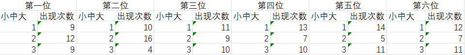 列出近30期大中小号出现次数(小=1,中=2,大=3)